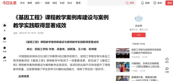 2.今日头条:《基因工程》课程教学案例库建设与案例教学实践取得显著成效