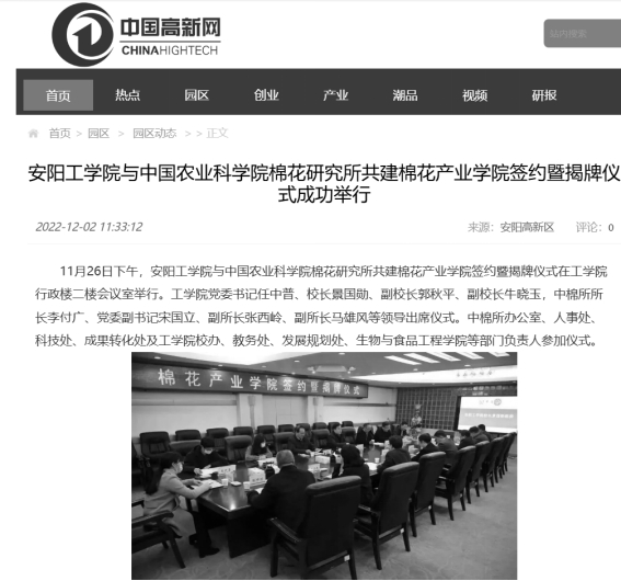 4.中国高新网:beat365在线唯一官网与中国农业科学院棉花研究所共建棉花产业学院签约暨揭牌仪式成功举行