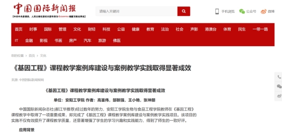 1.中国国际新闻报:《基因工程》课程教学案例库建设与案例教学实践取得显著成效