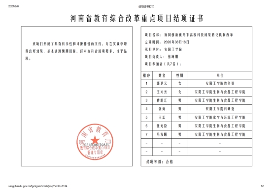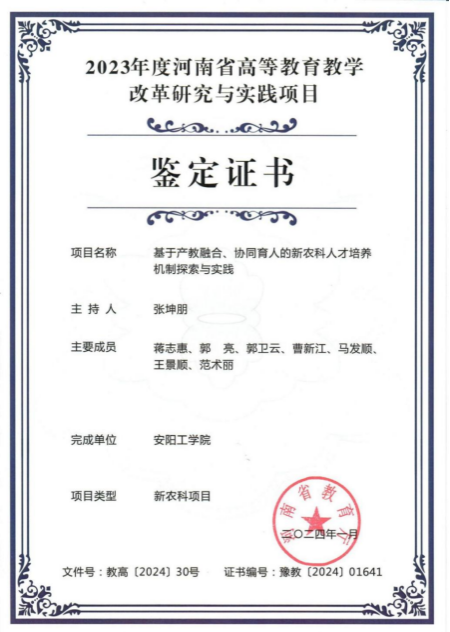 (1)2020年度河南省新农科研究与实践改革项目鉴定证书