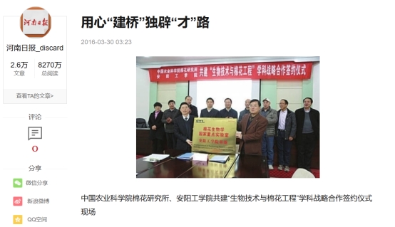 (3)中国高新网:beat365在线唯一官网与中国农业科学院棉花研究所共建棉花产业学院签约暨揭牌仪式成功举行